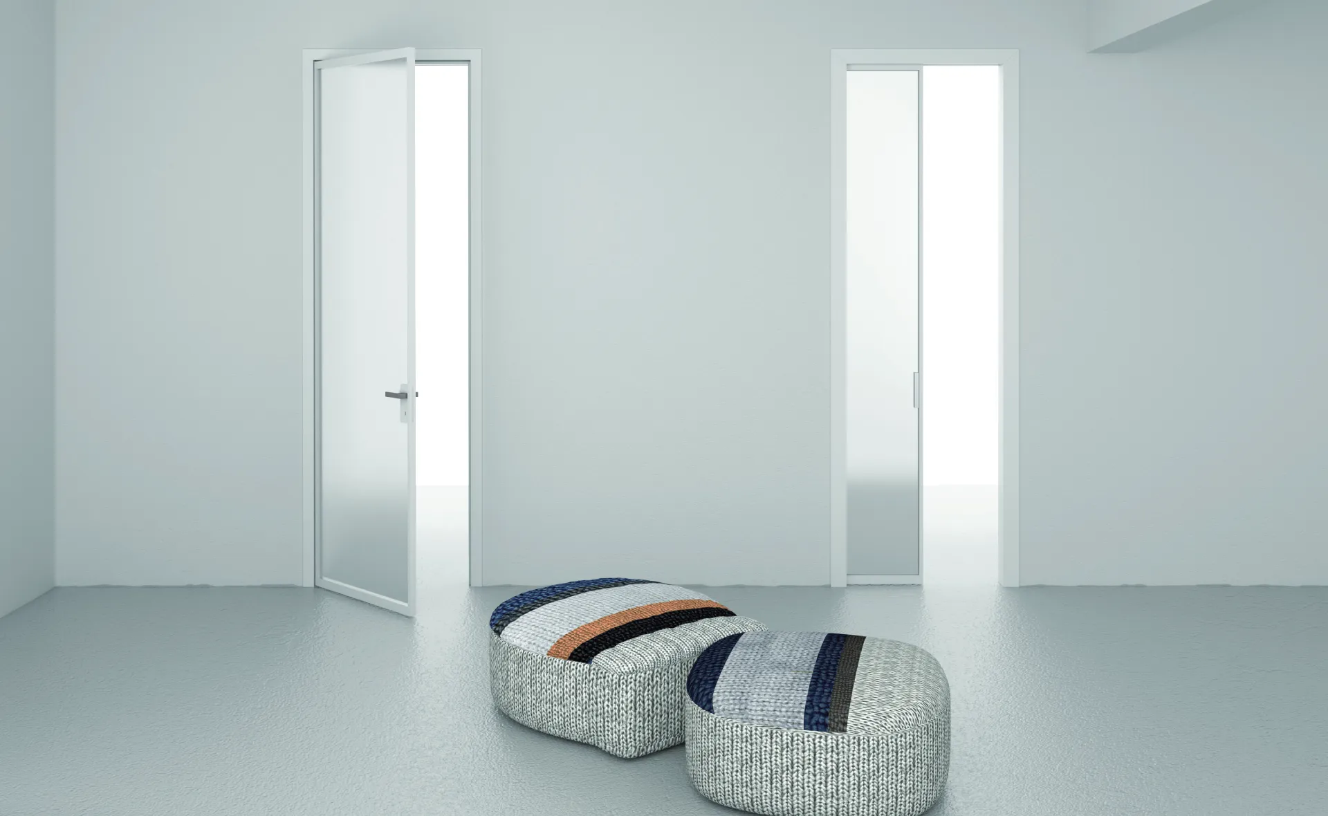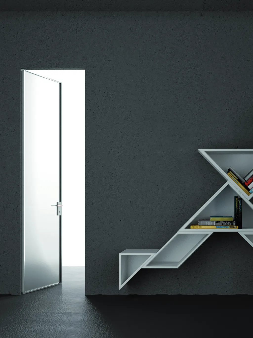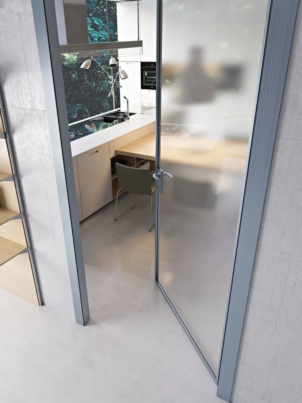 La Porta risulta a filo con il muro, non appesantisce lo spazio e dà un senso di pulizia. La struttura in alluminio valorizza e a sua volta è valorizzata dal vetro che migliora la luminosità degli ambienti.