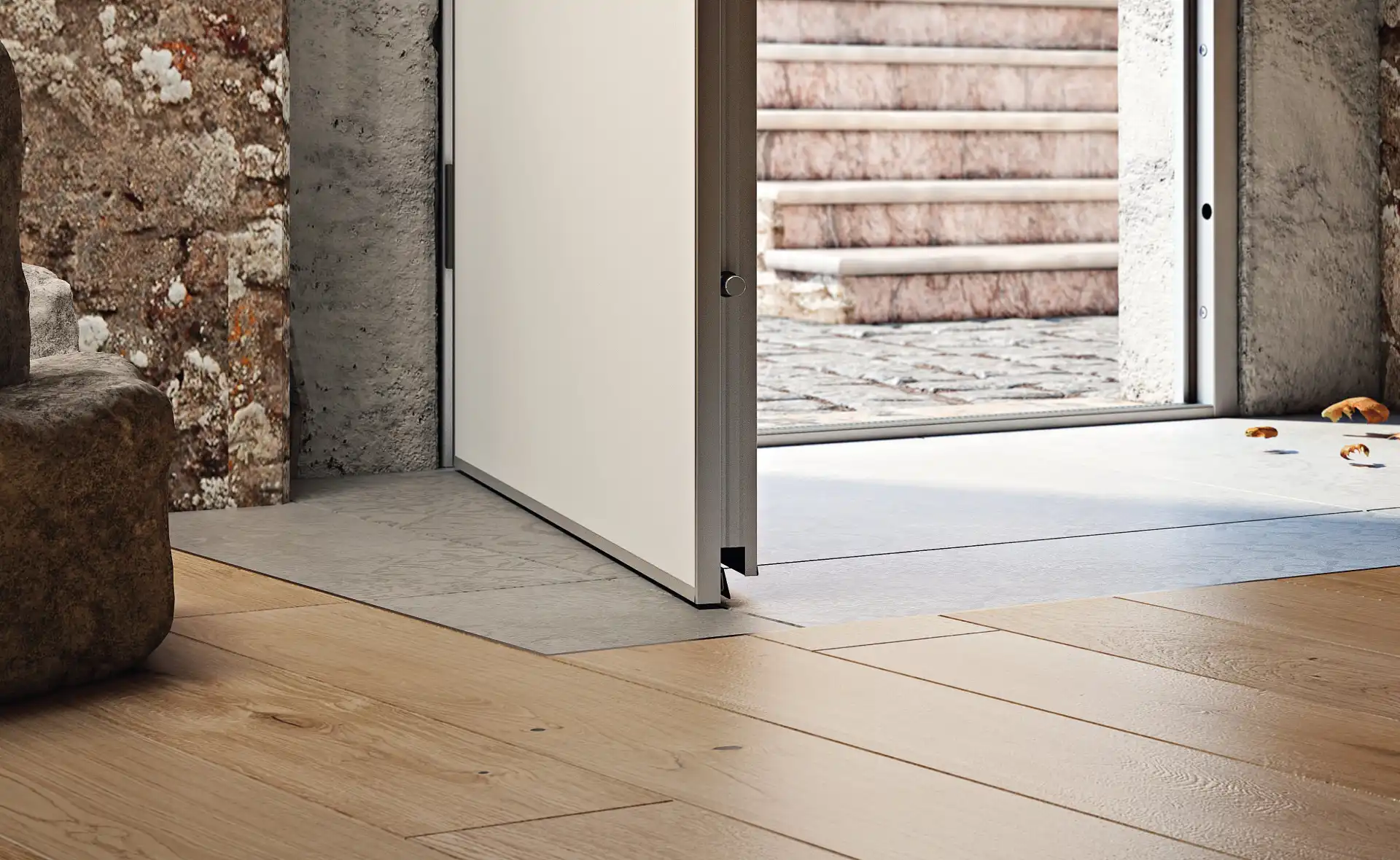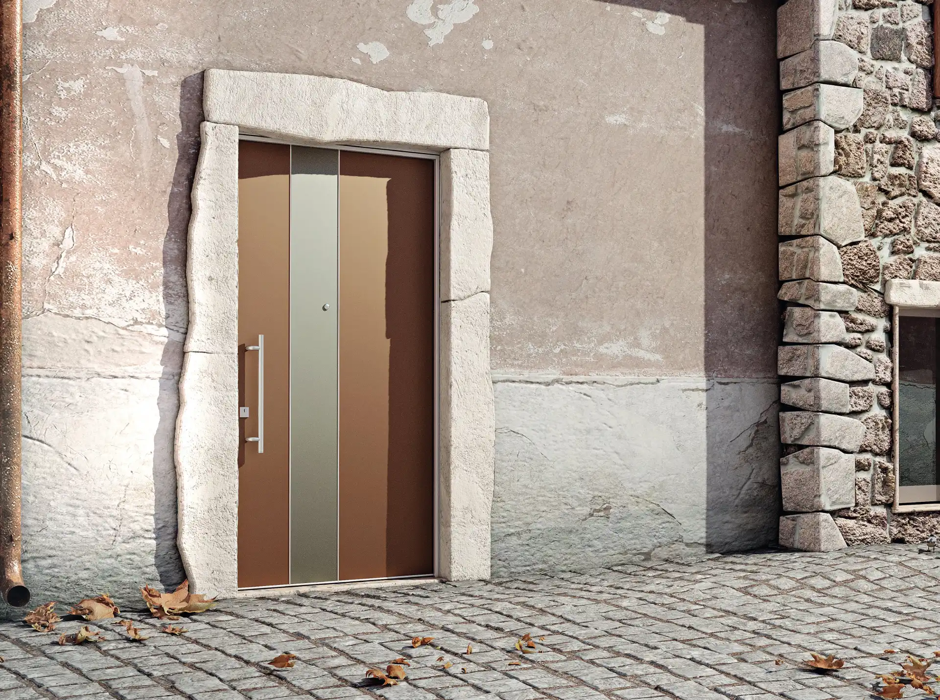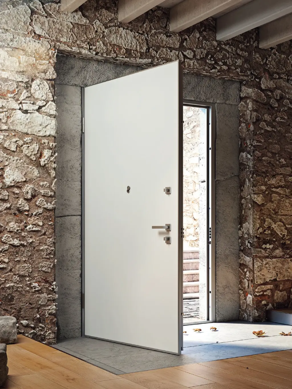 Porta di sicurezza con cerniera a vista. La struttura di questa porta è in acciaio elettrozincato con una coibentazione totale della porta. Soluzione dal design estremamente minimal che si adatta con eleganza a qualsiasi ambiente.