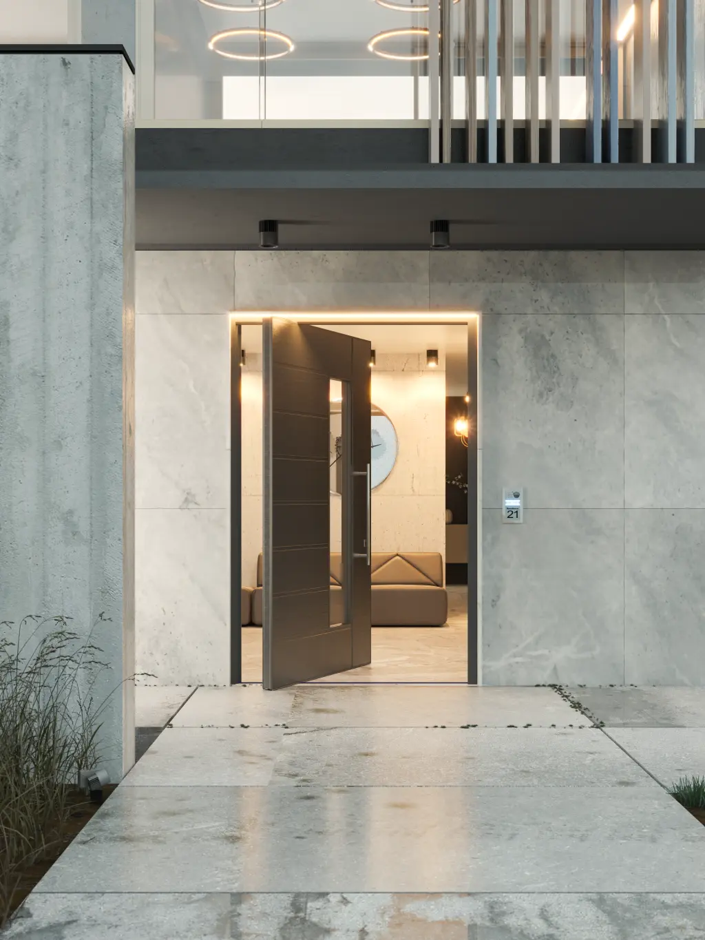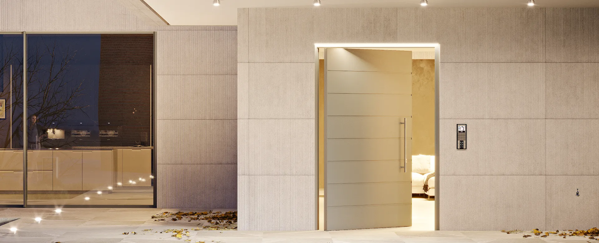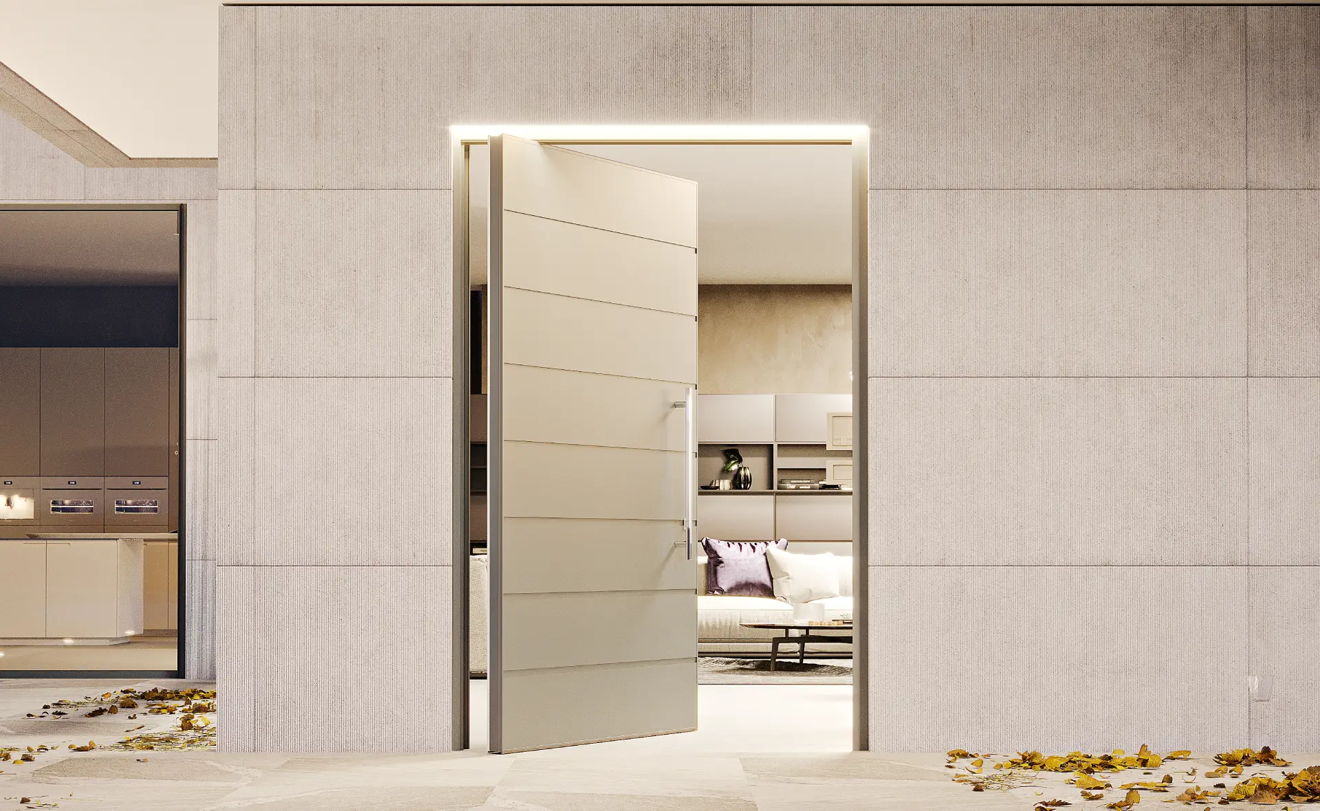 La porta si apre ruotando sul perno verticale e permette di ottenere un effetto di continuità tra gli ambienti con un’atmosfera moderna e accogliente. La porta bilico P100 è infatti composta da rivestimenti in alluminio ideale per le grandi dimensioni.